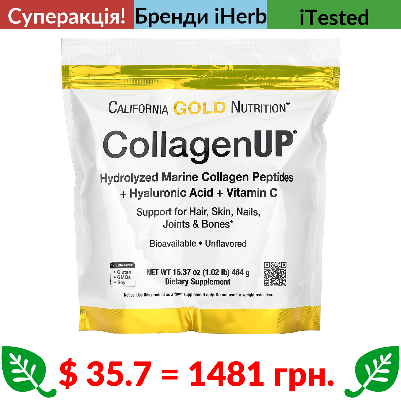 $ 35.7 = 1481 грн. ???? cуперакція! ???? California Gold Nutrition, CollagenUP, пептиди гідролізованого морського колагену з гіалуроновою кислотою та вітаміном C, без добавок, 464 г (16,37 фунта)