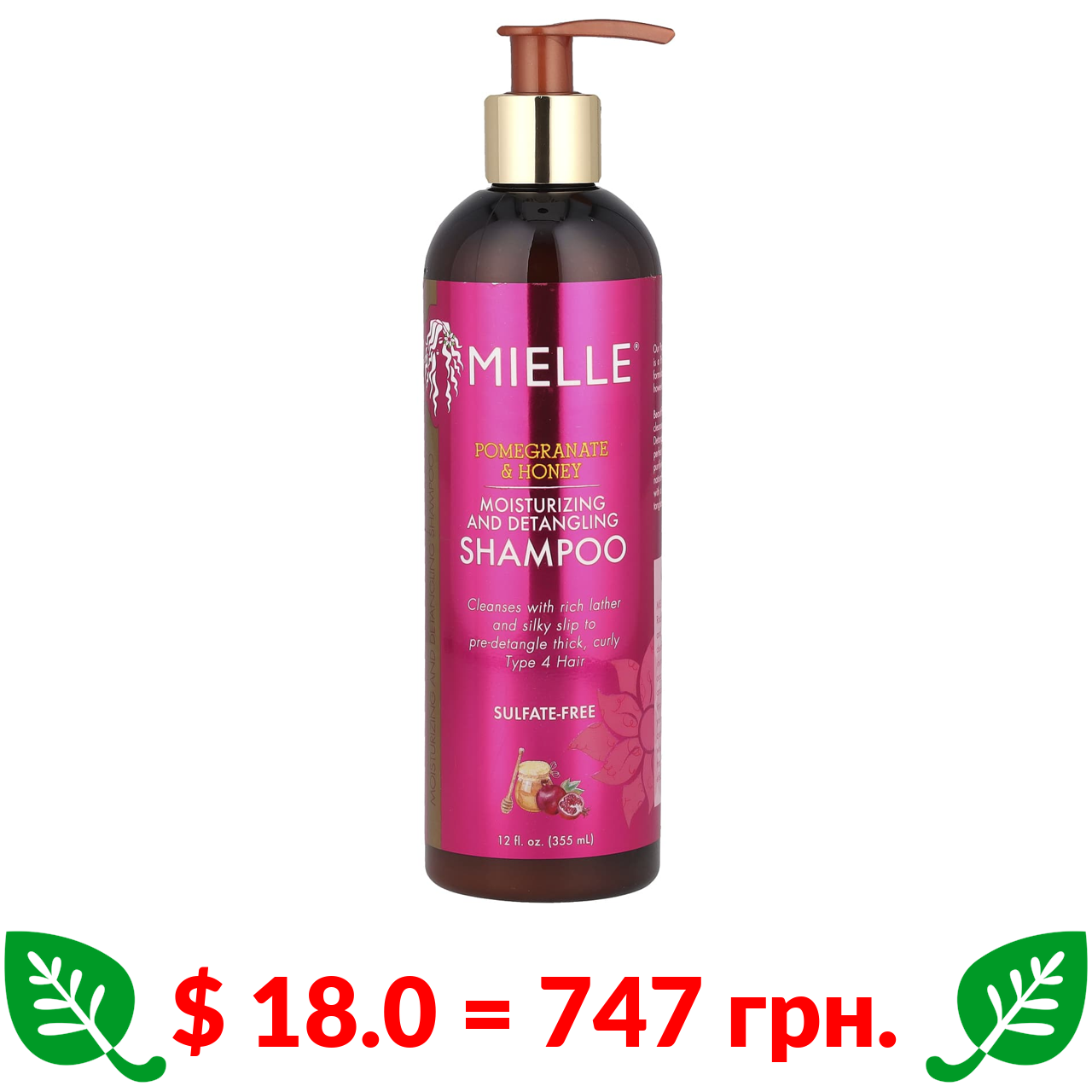 $ 18.0 = 747 грн. Mielle, Шампунь для зволоження та розчісування волосся, гранат і мед, 355 мл (12 рідк. унцій)