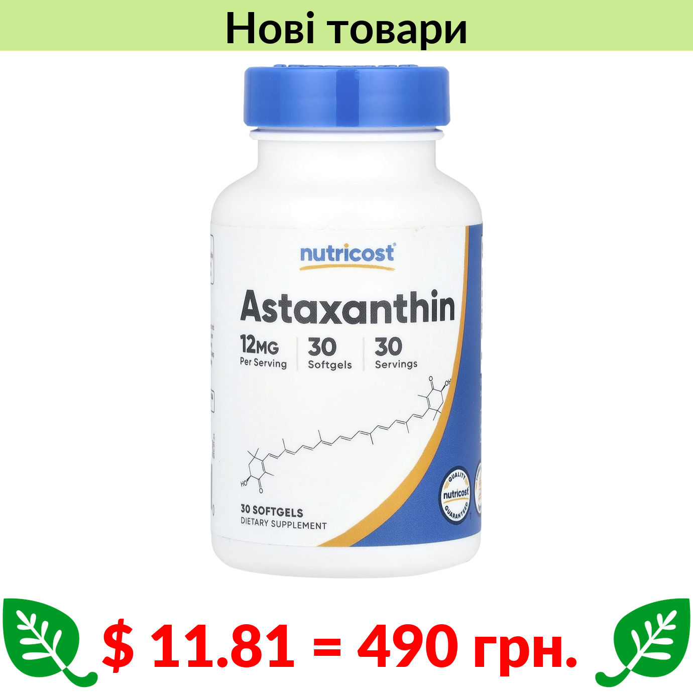 $ 11.81 = 490 грн. ????️ у кошику ????️ Nutricost, астаксантин, 12 мг, 30 м’яких капсул