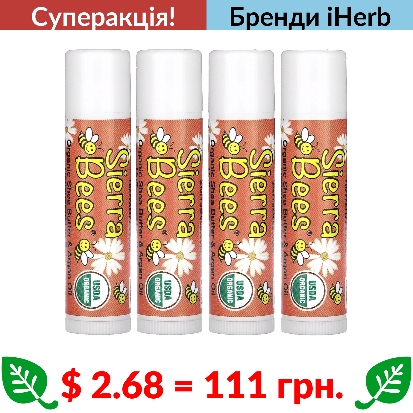 $ 2.68 = 111 грн. ???? cуперакція! ???? Sierra Bees, органічний бальзам для губ, масло ши й арганова олія, 4 шт., по 4,25 г (0,15 унції)