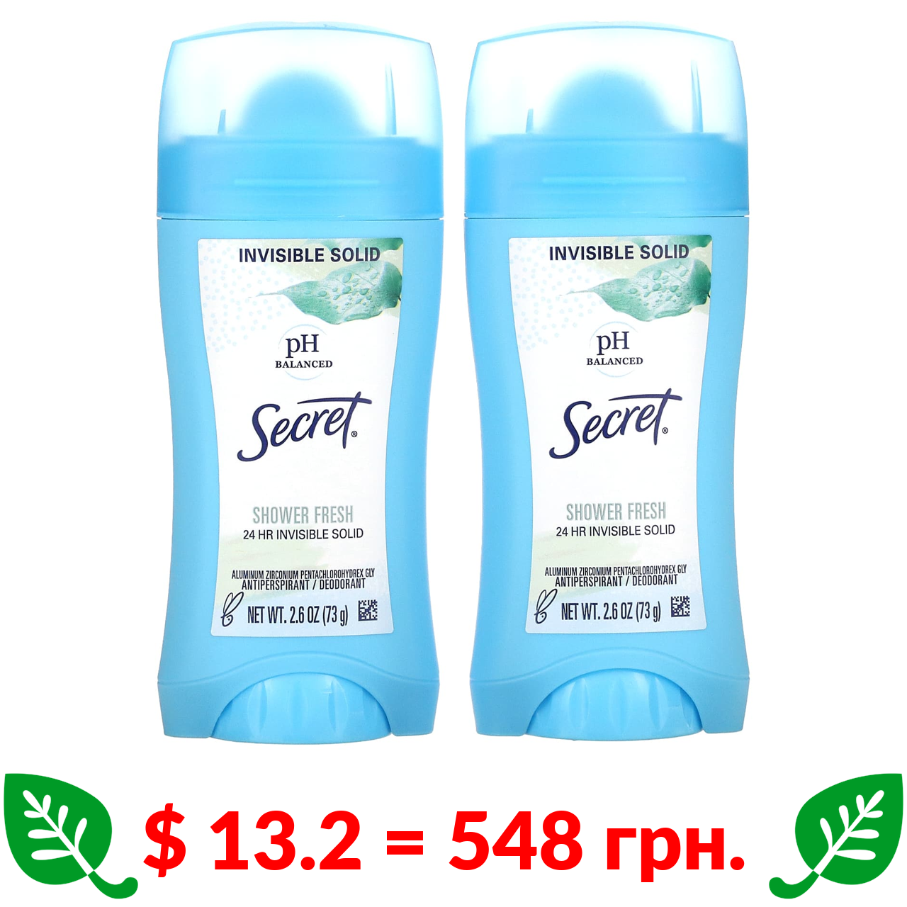 $ 13.2 = 548 грн. Secret, антиперспірант/дезодорант із збалансованим рівнем pH, невидимий захист, свіжий аромат, два продукти, по 73 г (2,6 унції) кожний