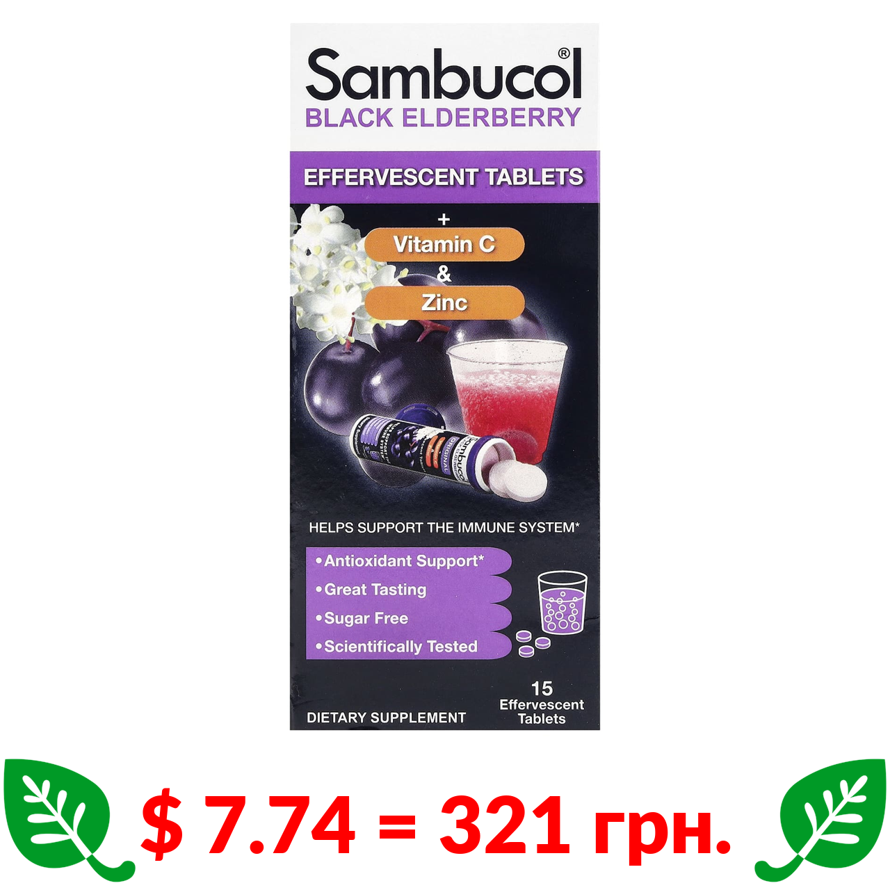 $ 7.74 = 321 грн. ????️ у кошику ????️ Sambucol, чорна бузина, шипучі таблетки з вітаміном C та цинком, для дітей від 4 років, 15 шипучих таблеток