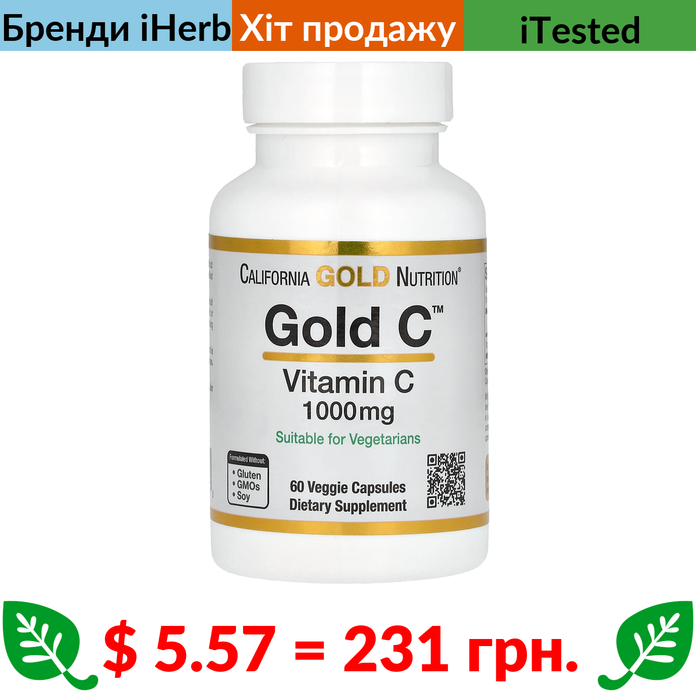 $ 5.57 = 231 грн. California Gold Nutrition, Gold C, вітамін С, 1000 мг, 60 вегетаріанських капсул