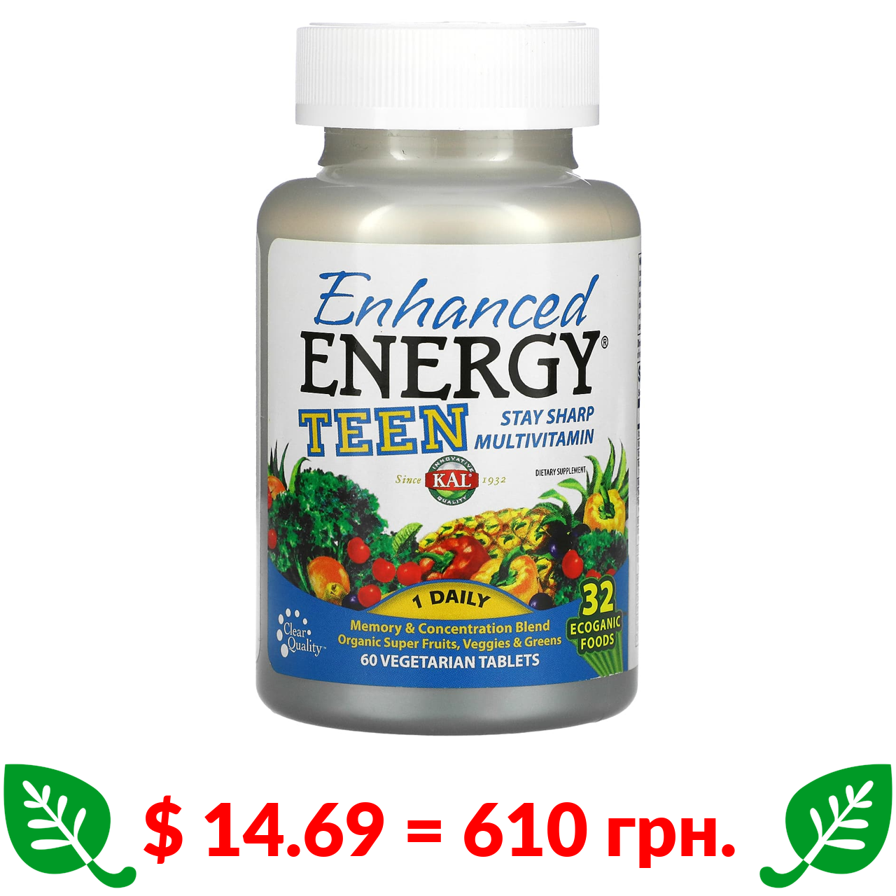 $ 14.69 = 610 грн. ????️ у кошику ????️ KAL, Enhanced Energy, суміш для покращення пам’яті й концентрації, для підлітків, 60 рослинних таблеток