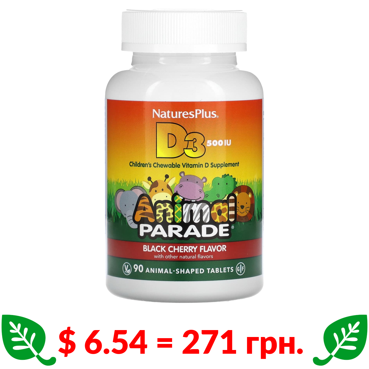 $ 6.54 = 271 грн. ????️ у кошику ????️ Nature’s Plus, Source of Life, Animal Parade, вітамін D3, смак чорної вишні, 500 МО, 90 таблеток у формі тварин