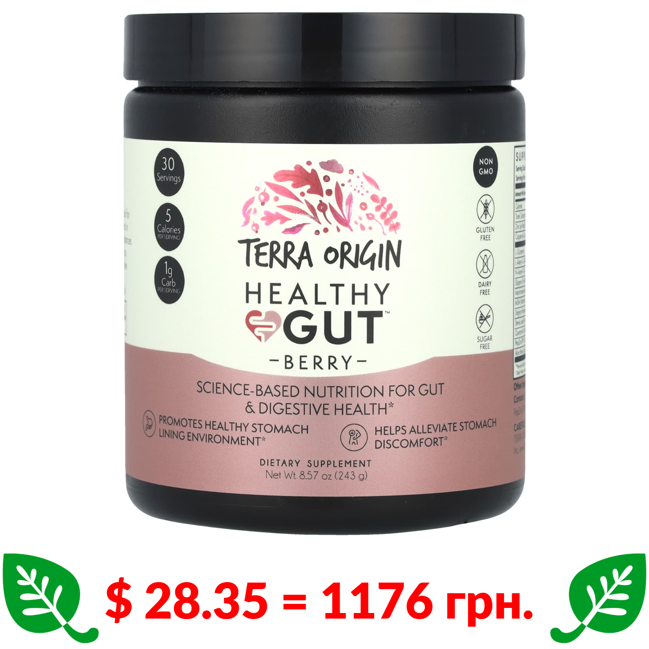 $ 28.35 = 1176 грн. Terra Origin, добавка для нормалізації функцій шлунково-кишкового тракту, смак ягід, 243 г (8,57 унції)