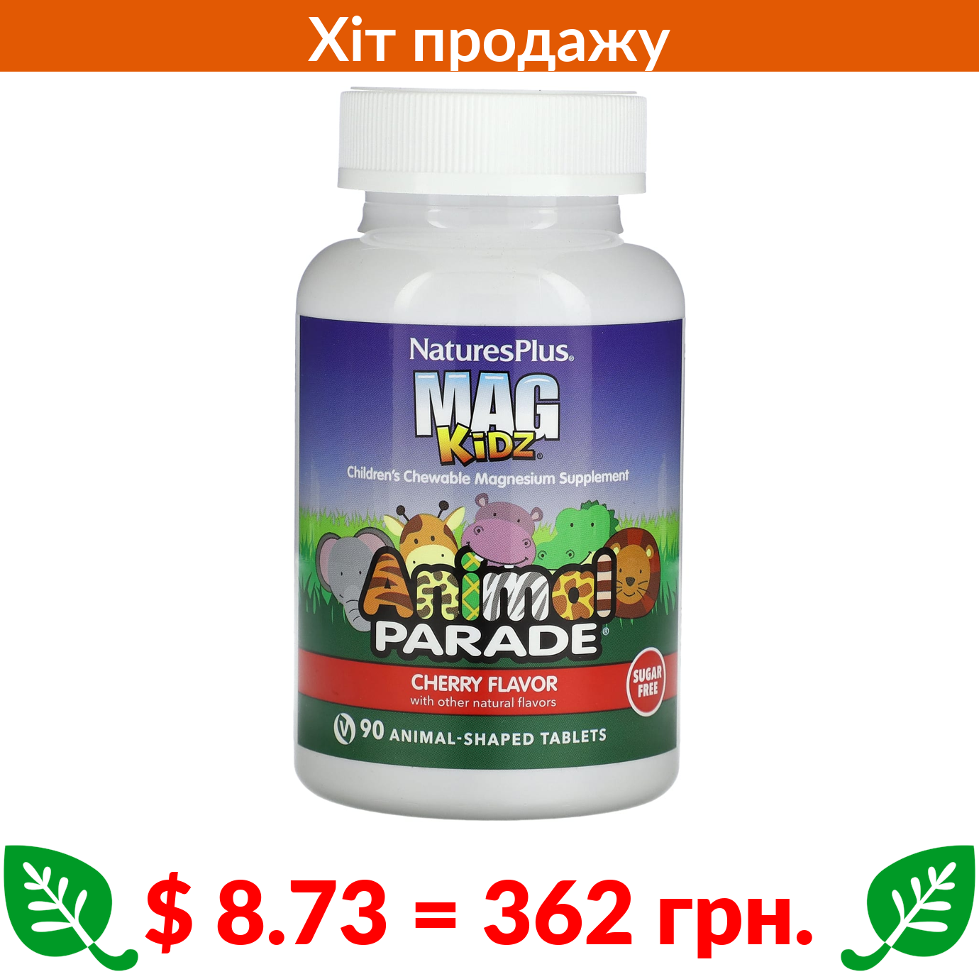 $ 8.73 = 362 грн. ????️ у кошику ????️ Nature’s Plus, MagKidz, Animal Parade, жувальні таблетки з магнієм для дітей, вишня, 90 таблеток у формі тварин