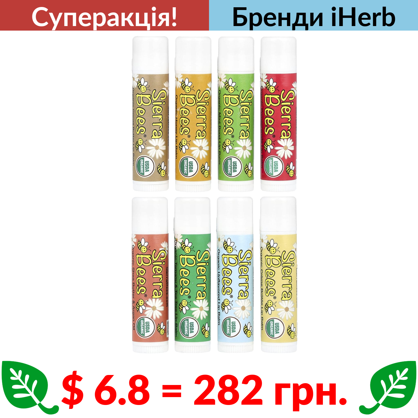 $ 6.8 = 282 грн. ???? cуперакція! ???? Sierra Bees, набір органічних бальзамів для губ, 8 шт,. по 4,25 г (0,15 унції)