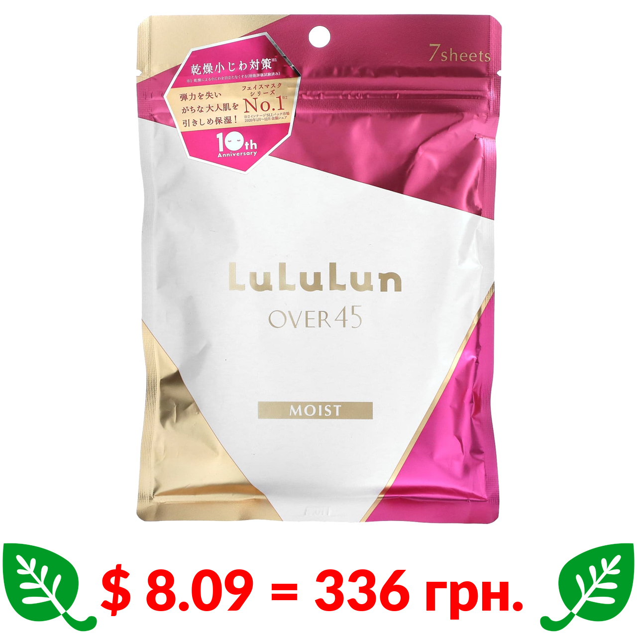 $ 8.09 = 336 грн. Lululun, Over 45 Beauty, тканинна маска, 045C рожевий, 7 шт., 113 мл (3,82 рідк. унції)