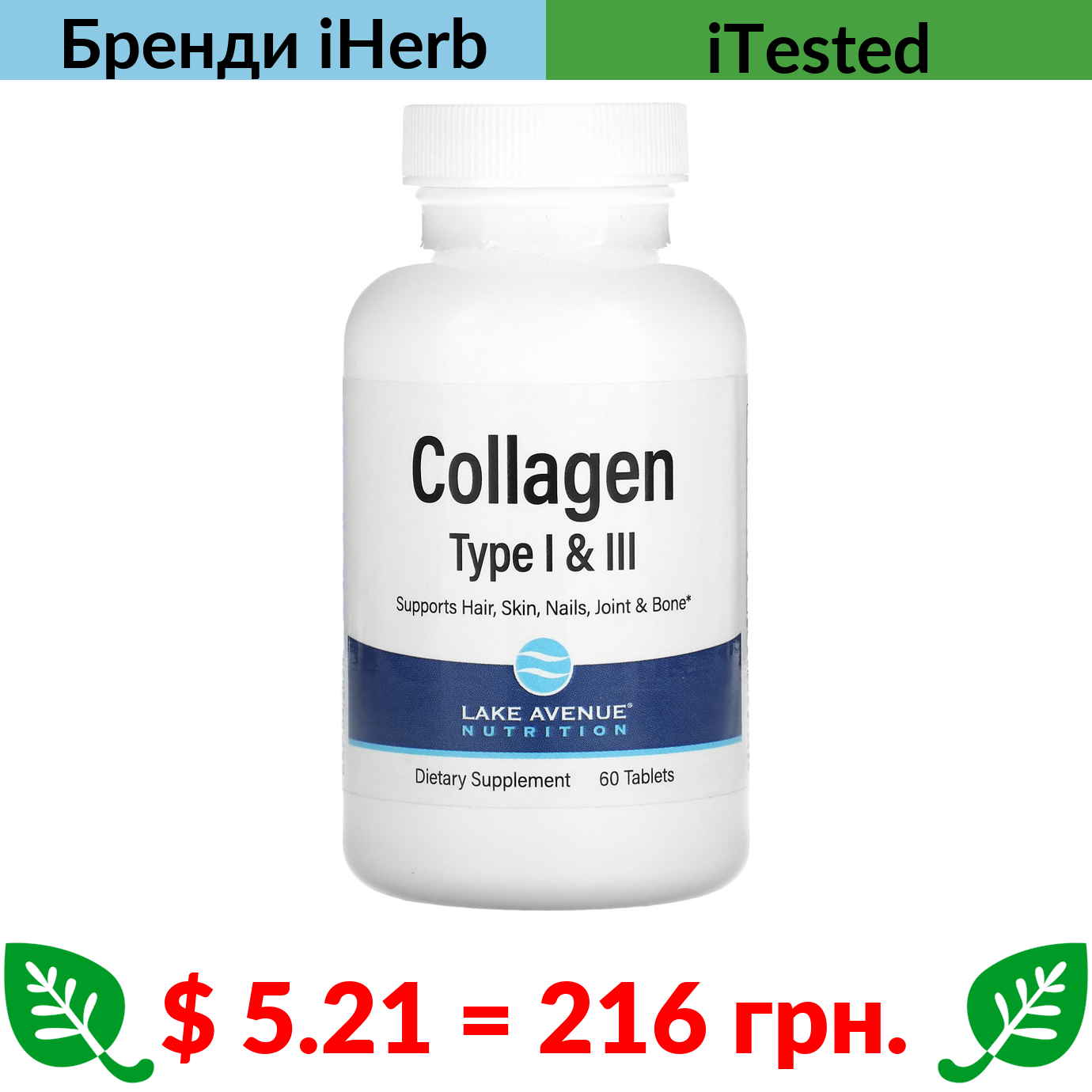 $ 5.21 = 216 грн. Lake Avenue Nutrition, гідролізований колаген I й III типів, 3000 мг, 60 таблеток (1000 мг у таблетці)