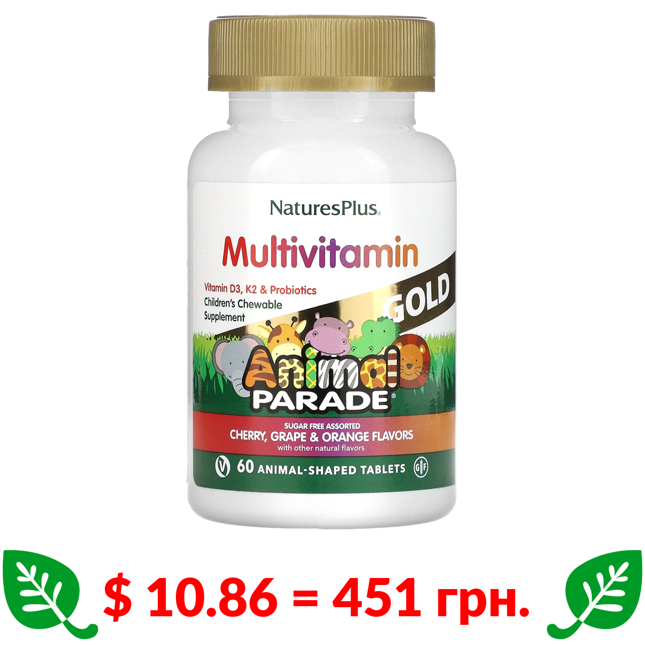 $ 10.86 = 451 грн. ????️ у кошику ????️ Nature’s Plus, Source of Life, Animal Parade Gold, жувальна добавка для дітей із мультивітамінами та мікроелементами, асорті смаків, 60 таблеток у формі тварин