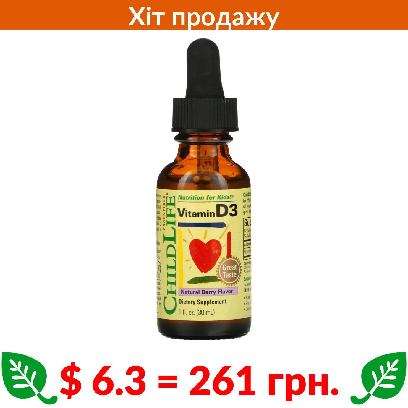 $ 6.3 = 261 грн. ????️ у кошику ????️ ChildLife Essentials, вітамін D3, зі смаком натуральних ягід, 30 мл (1 рідк. унція)