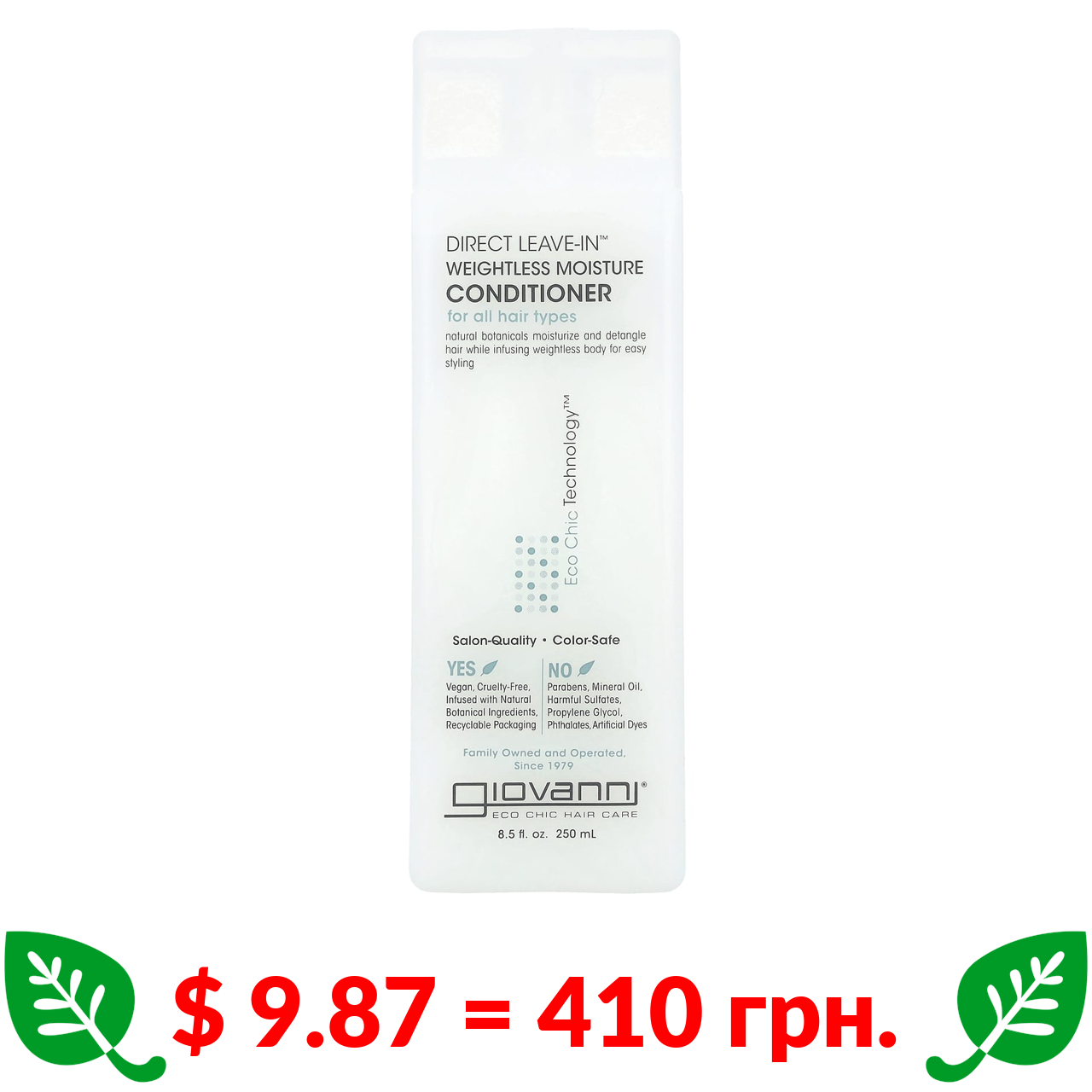 $ 9.87 = 410 грн. Giovanni, Direct Leave-In, кондиціонер для невагомого зволоження, для всіх типів волосся, 250 мл (8,5 рідк. унцій)