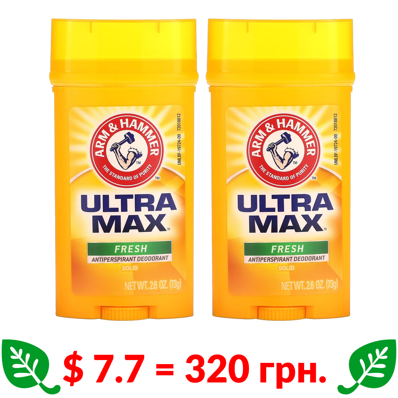 $ 7.7 = 320 грн. Arm & Hammer, UltraMax, твердий дезодорант-антиперспірант для чоловіків, зі свіжим ароматом, подвійна упаковка, 73 г (2,6 унції) кожен