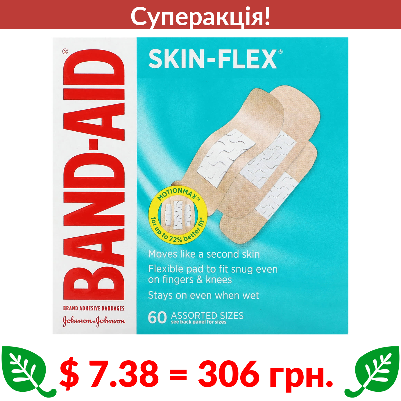 $ 7.38 = 306 грн. ???? cуперакція! ???? Band Aid, пластирі, Skin-Flex, різні розміри, 60 шт