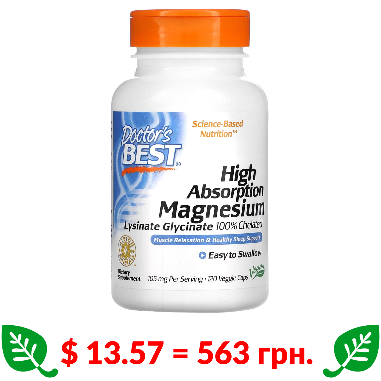 $ 13.57 = 563 грн. Doctor’s Best, магній із високим рівнем засвоєння, 105 мг, 120 веганських капсул (52,5 мг у капсулі)