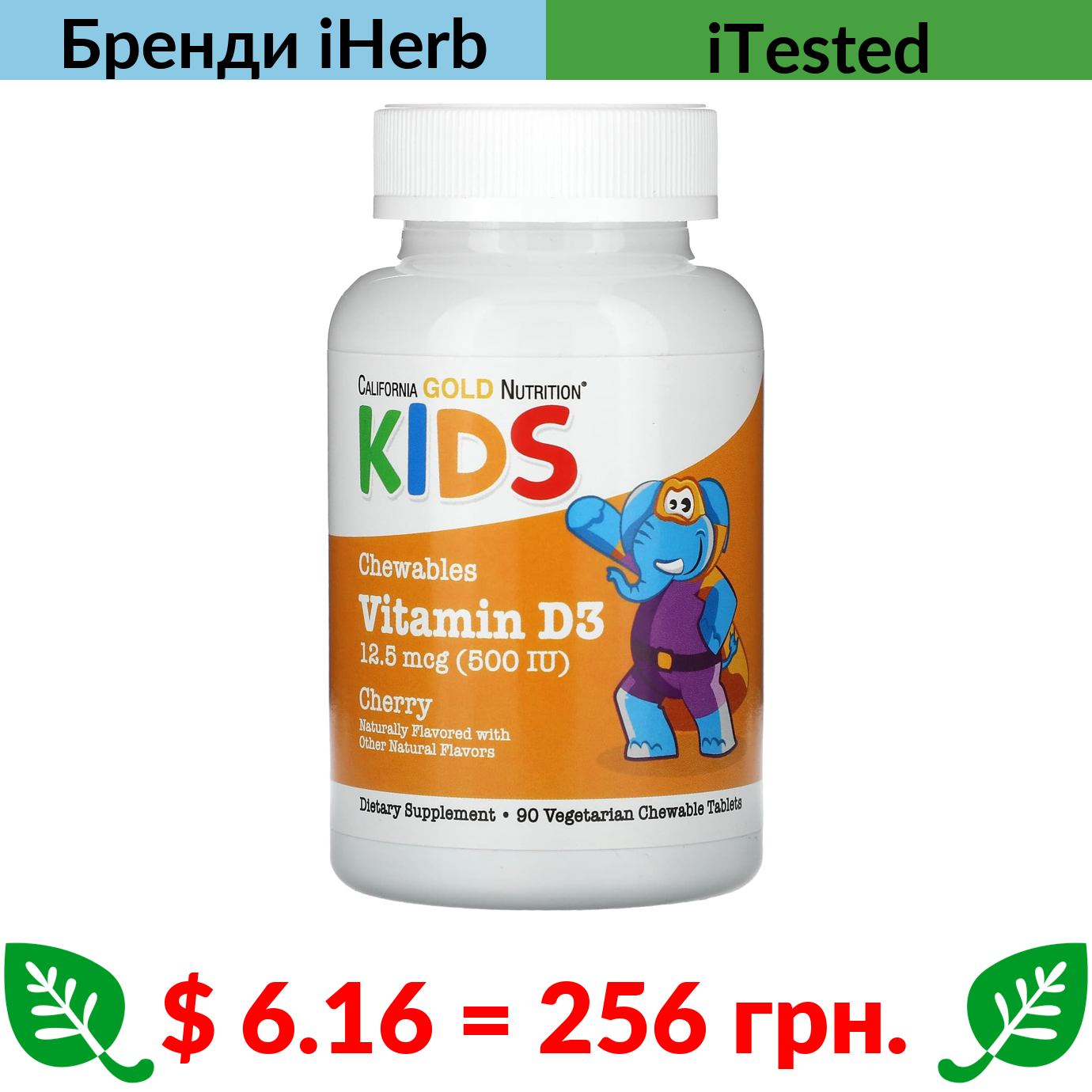$ 6.16 = 256 грн. ????️ у кошику ????️ California Gold Nutrition, жувальний вітамін D3 для дітей, зі смаком натуральної вишні, 12,5 мкг (500 МО), 90 вегетаріанських таблеток