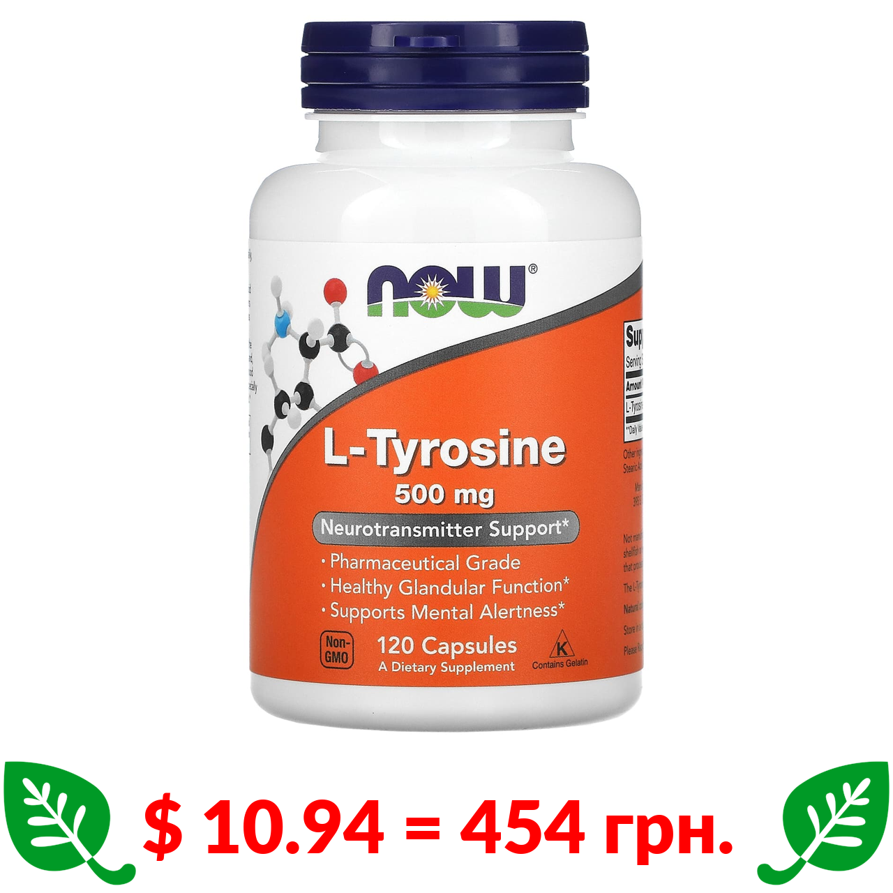 $ 10.94 = 454 грн. Now Foods, L-тирозин, 500 мг, 120 капсул
