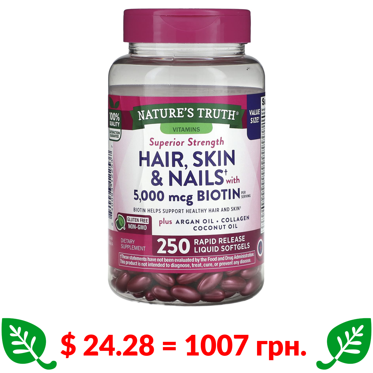 $ 24.28 = 1007 грн. Nature’s Truth, добавка для волосся, шкіри та нігтів із біотином, 250 капсул із рідиною для швидкого вивільнення