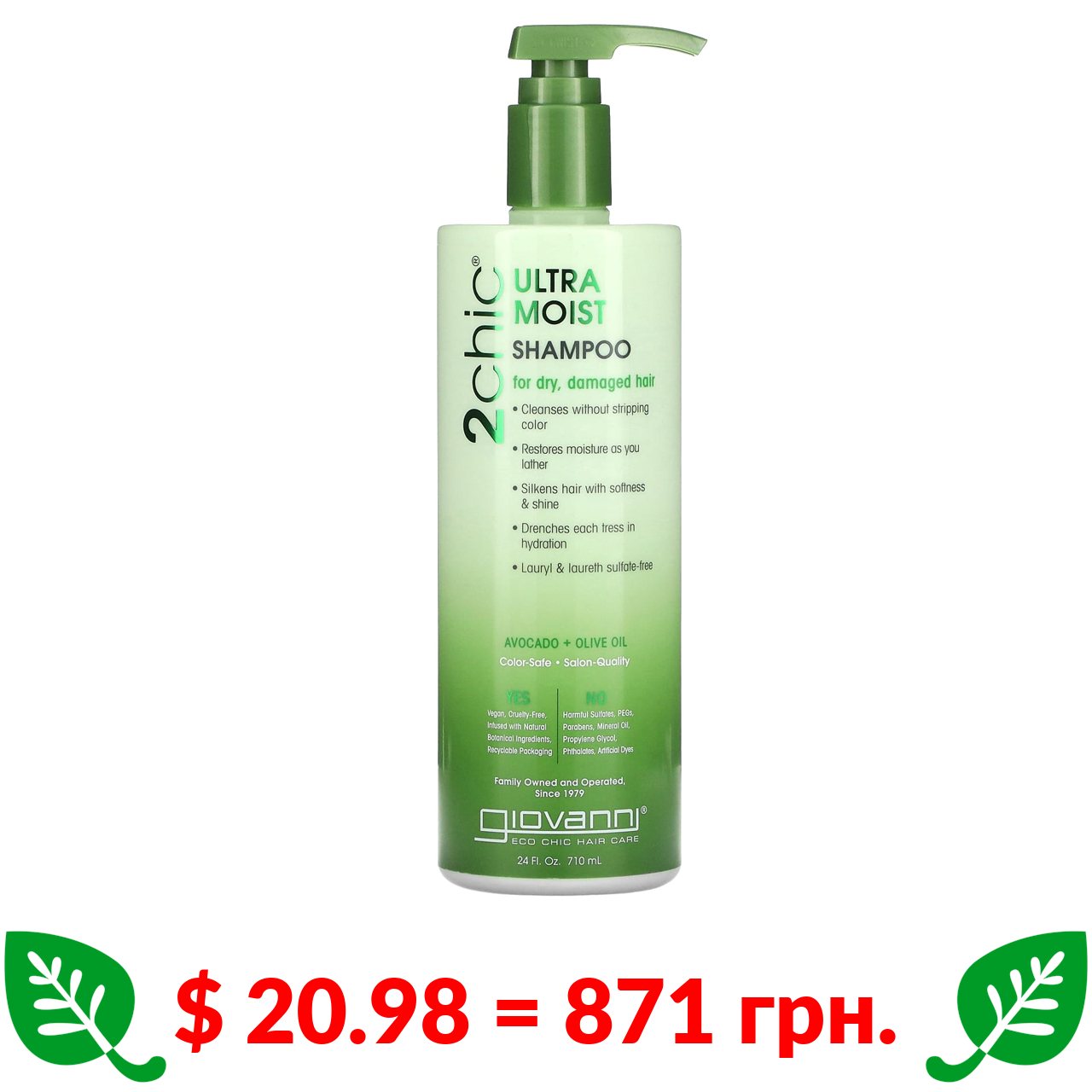 $ 20.98 = 871 грн. Giovanni, 2chic, ультразволожувальний шампунь для сухого, пошкодженого волосся, авокадо та оливкова олія, 710 мл (24 рідк. унції)
