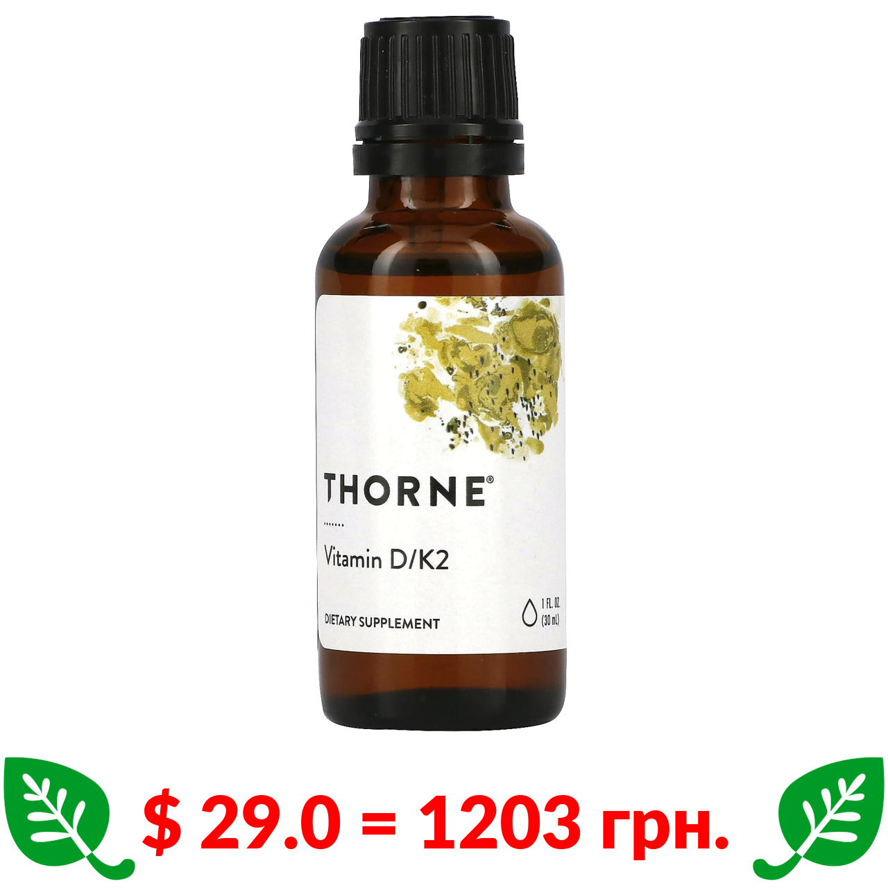 $ 29.0 = 1203 грн. Thorne, вітамін D з вітаміном K2, 25 мкг (1000 МО), 30 мл (1 рідк. унція)