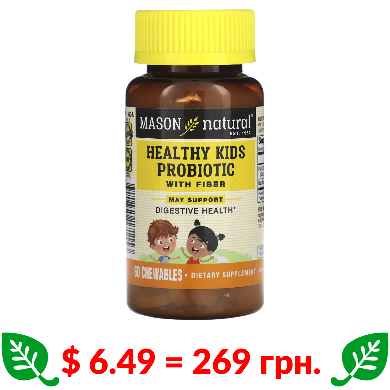 $ 6.49 = 269 грн. ????️ у кошику ????️ Mason Natural, пробіотик із клітковиною для здоров’я дітей, 60 жувальних таблеток