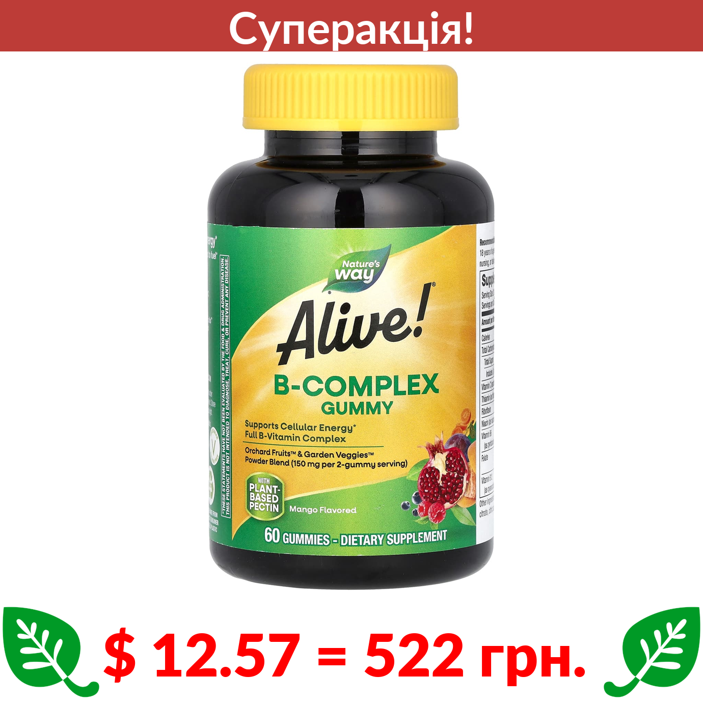 $ 12.57 = 522 грн. ???? cуперакція! ???? Nature’s Way, Alive! комплекс вітамінів групи В у жувальних таблетках, смак манго, 60 жувальних таблеток