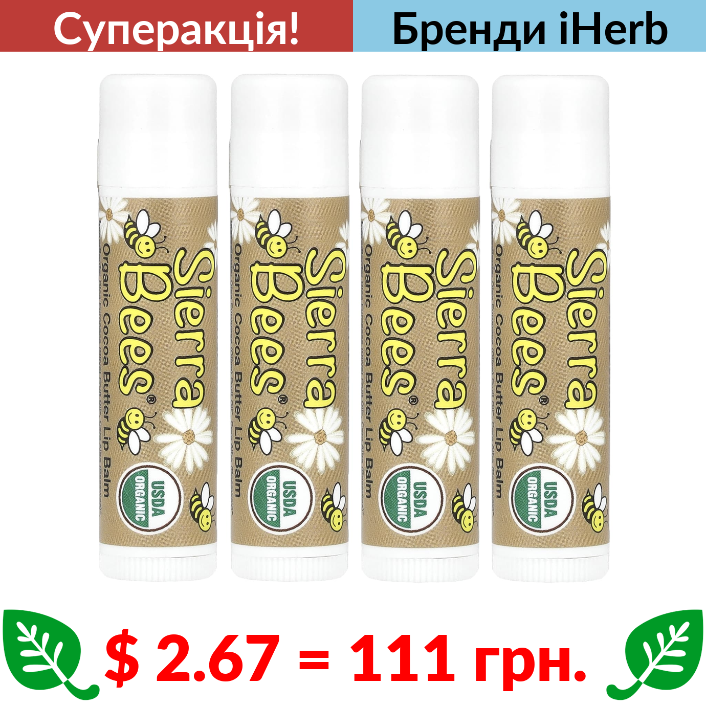 $ 2.67 = 111 грн. ???? cуперакція! ???? Sierra Bees, органічний бальзам для губ, масло какао, 4 шт. в упаковці, по 4,25 г (0,15 унції)