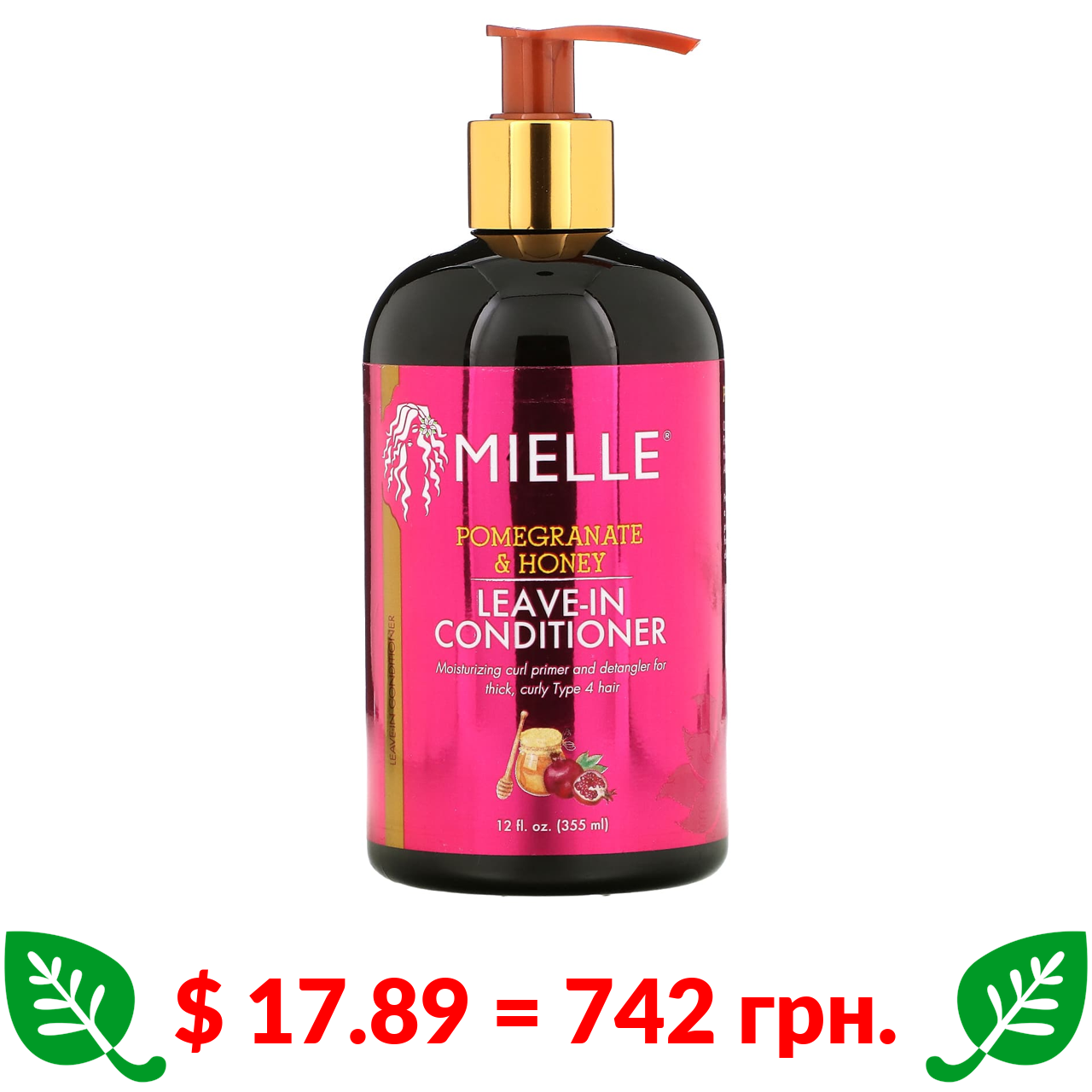 $ 17.89 = 742 грн. Mielle, Незмивний кондиціонер, гранат і мед, 12 рідких унцій (355 мл)