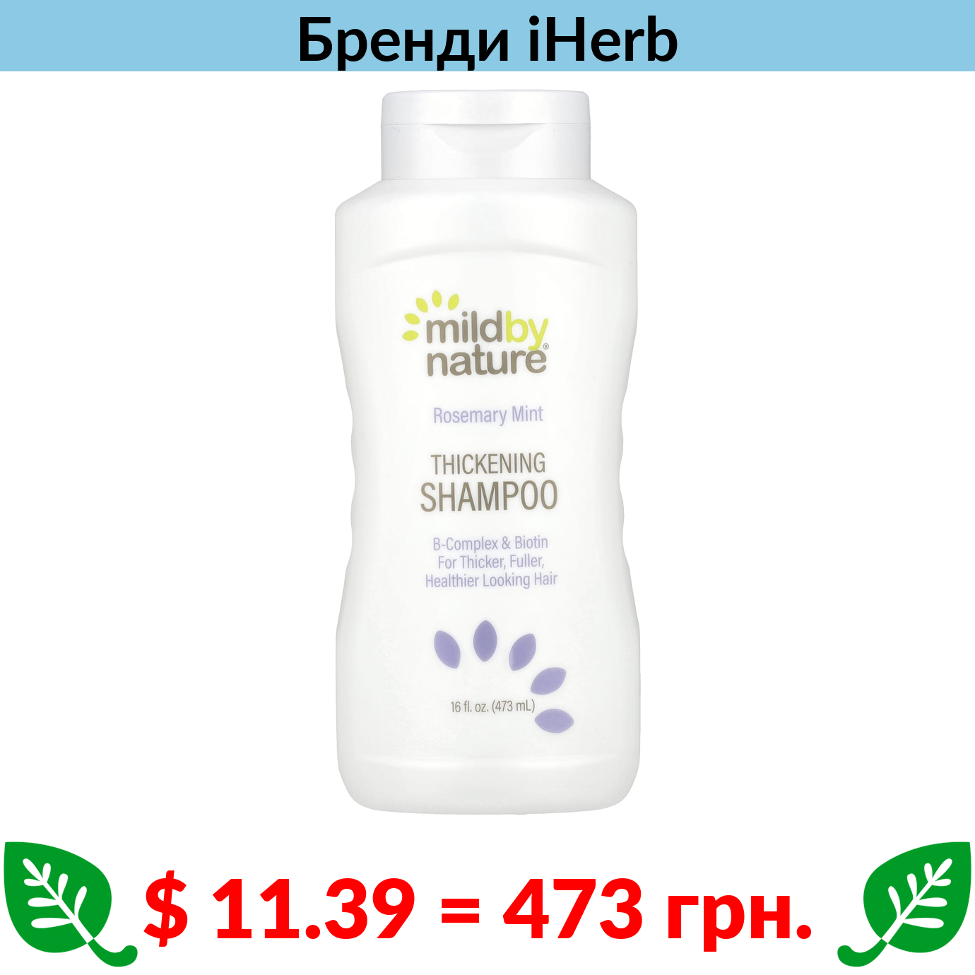 $ 11.39 = 473 грн. Mild By Nature, шампунь для густоти волосся, з комплексом вітамінів групи B та біотином, розмарин і м’ята, 473 мл (16 рідк. унцій)