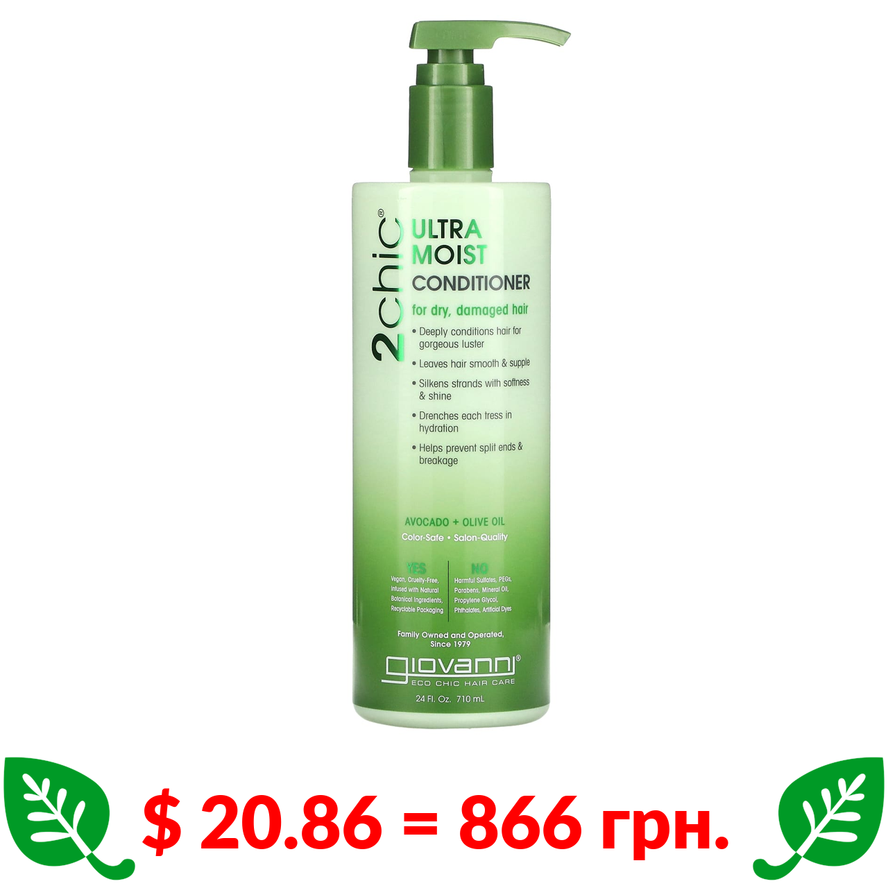 $ 20.86 = 866 грн. Giovanni, 2chic, Ультразволожуючий кондиціонер, для сухого, пошкодженого волосся, авокадо + оливкова олія, 24 рідких унції (710 мл)