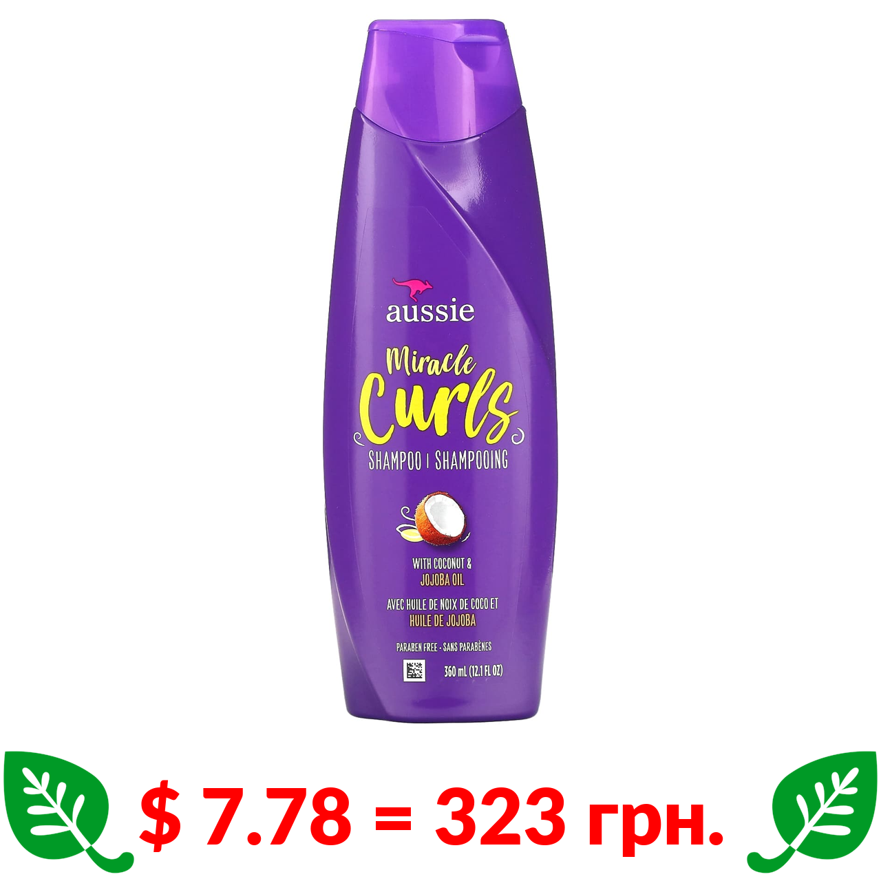 $ 7.78 = 323 грн. Aussie, Miracle Curls, шампунь з кокосовою олією та олією австралійського жожоба, 360 мл (12,1 рідк. унції)