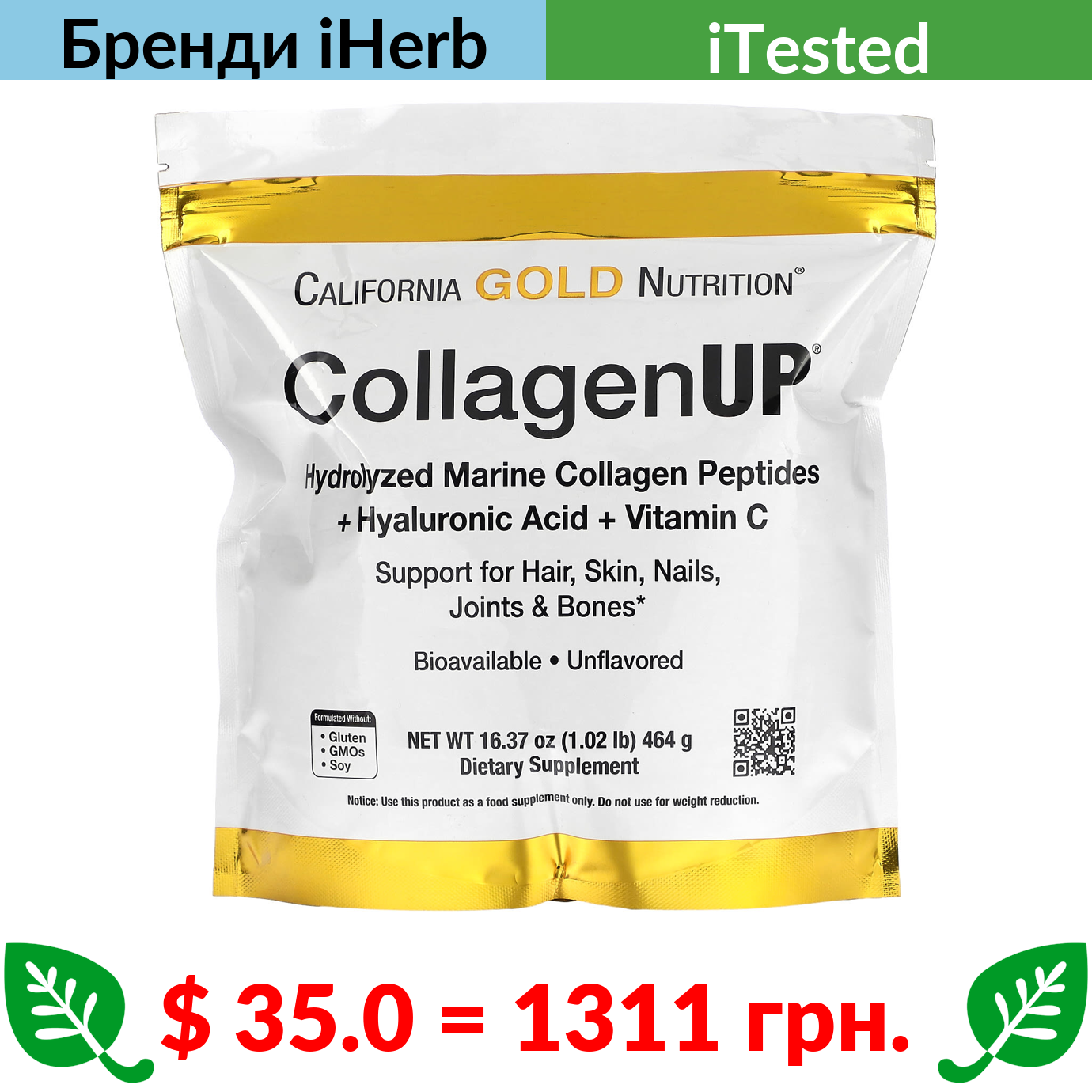 $ 35.0 = 1311 грн. California Gold Nutrition, CollagenUP, морський гідролізований колаген, гіалуронова кислота й вітамін С, без добавок, 464 г (16,37 унції)