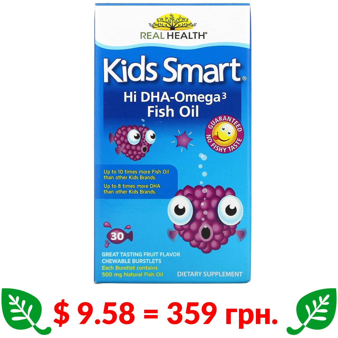 $ 9.58 = 359 грн. Bioglan, Kids Smart, риб’ячий жир із високим вмістом омега-3 ДГК, чудовий фруктовий смак, 30 жувальних капсул