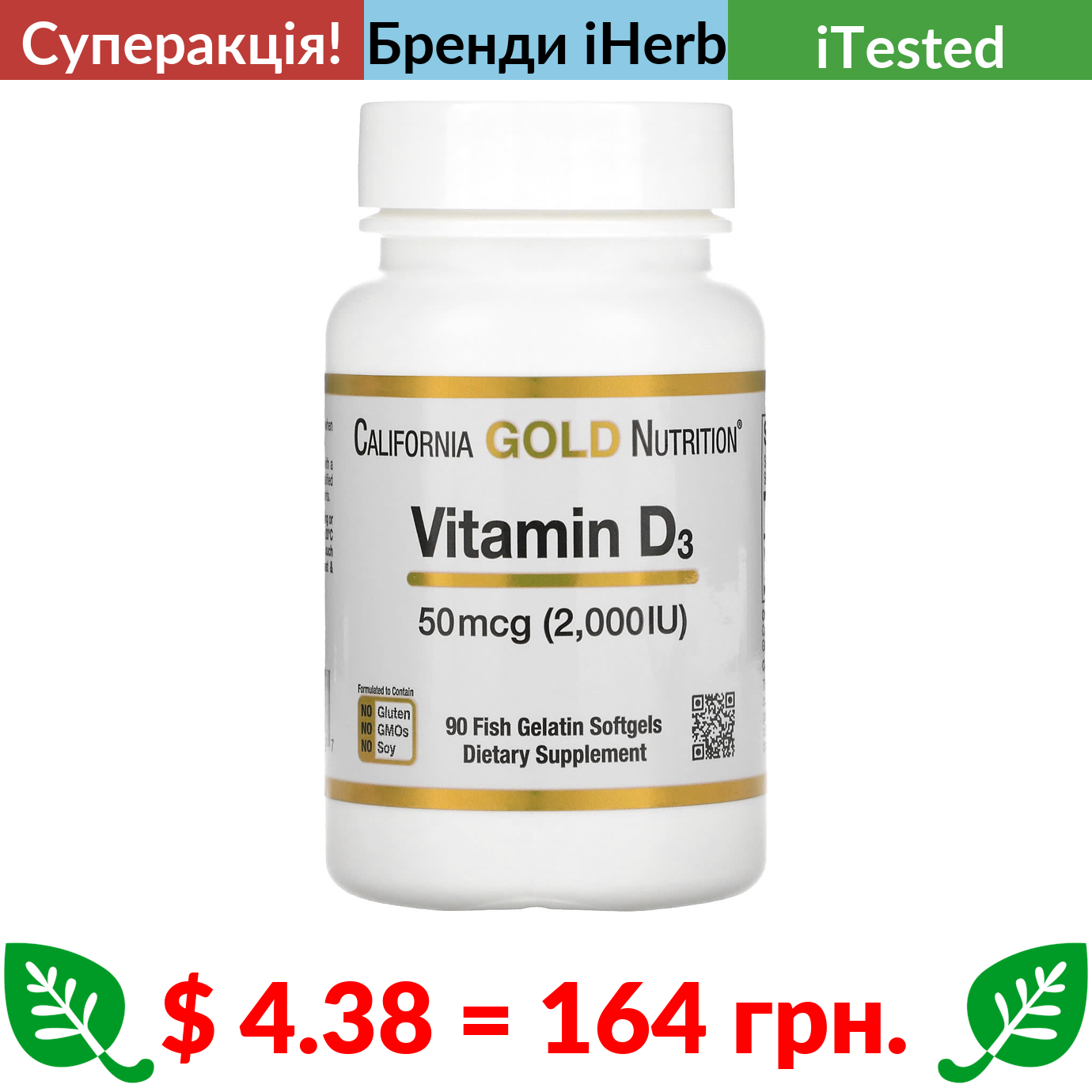 $ 4.38 = 164 грн. ???? cуперакція! ???? California Gold Nutrition, вітамін D3, 50 мг (2000 МО), 90 капсул із риб’ячого желатину
