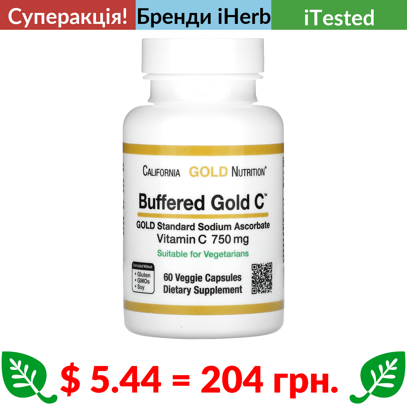 $ 5.44 = 204 грн. ???? cуперакція! ???? California Gold Nutrition, буферизований Gold C, GOLD Standard, аскорбат натрію (вітамін C), 750 мг, 60 вегетаріанських капсул
