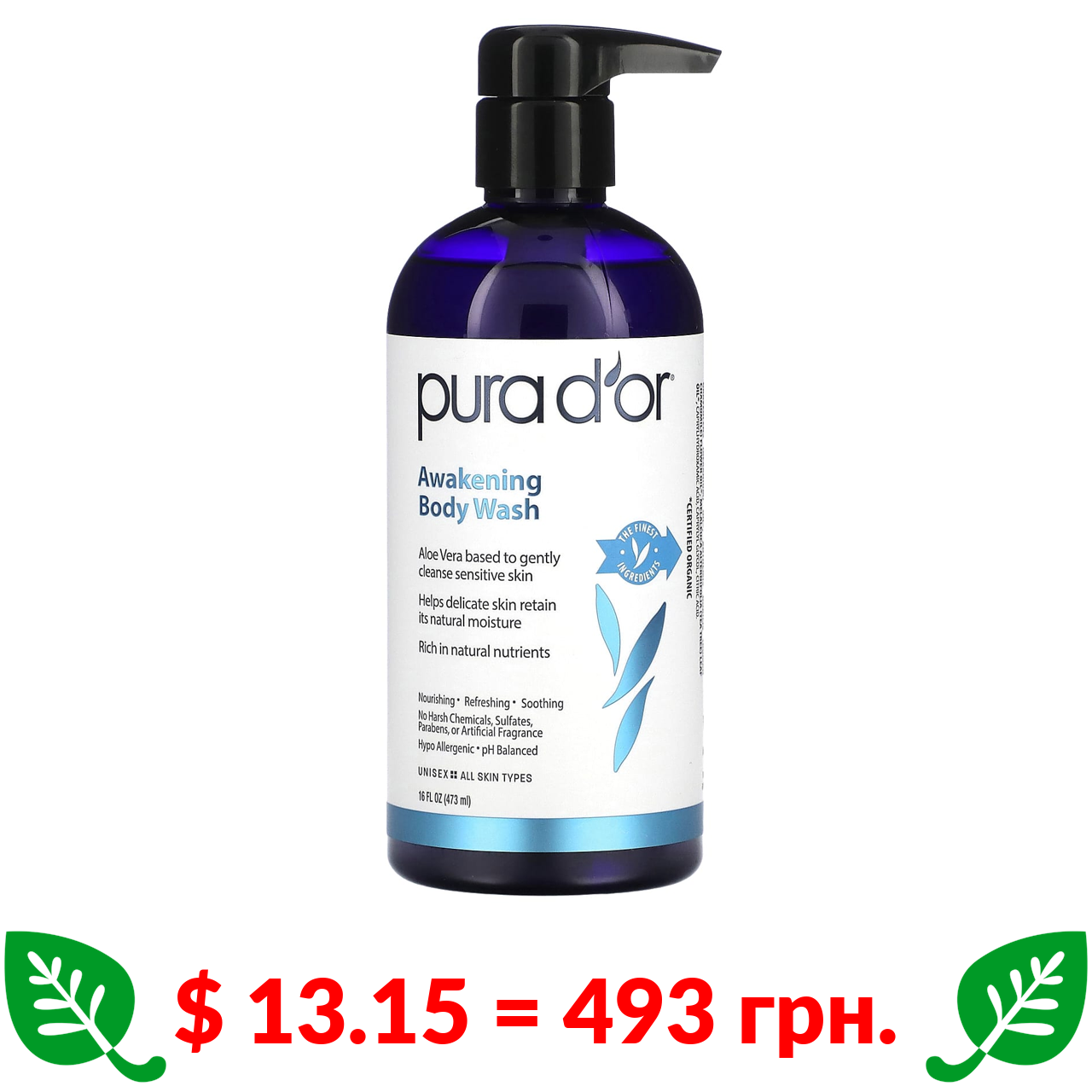 $ 13.15 = 493 грн. Pura D’or, Awakening Body Wash, 16 fl oz (473 ml)