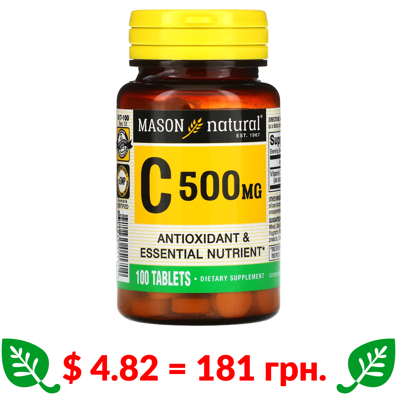 $ 4.82 = 181 грн. Mason Natural, вітамін C, 500 мг, 100 таблеток