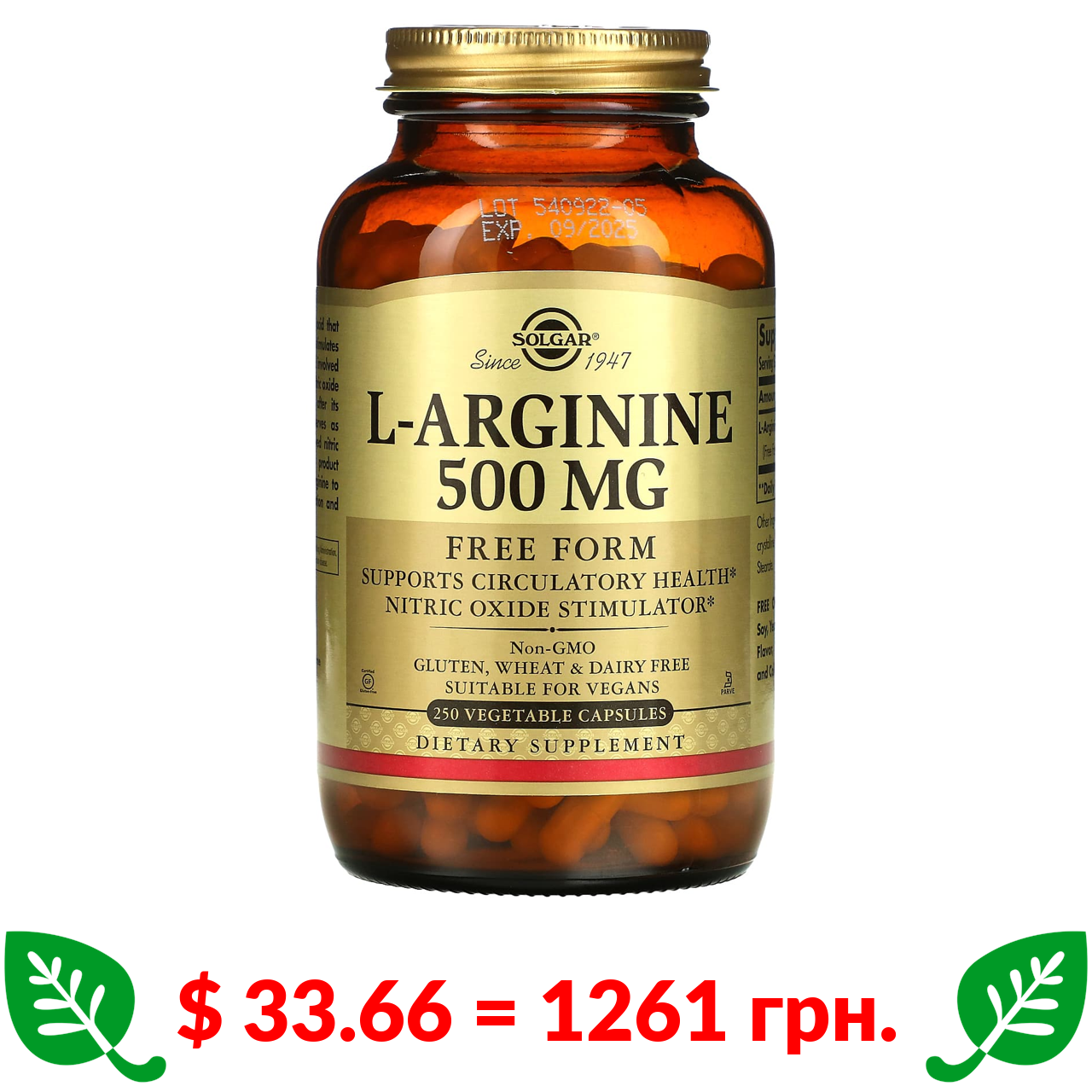 $ 33.66 = 1261 грн. Solgar, L-Arginine, Free Form, 500 mg, 250 Vegetable Capsules