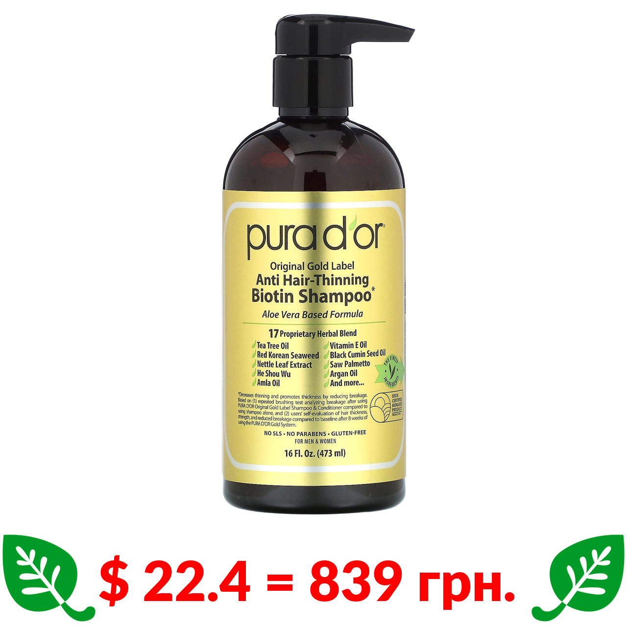 $ 22.4 = 839 грн. Pura D’or, шампунь проти випадіння волосся, 473 мл (16 рідк. унцій)