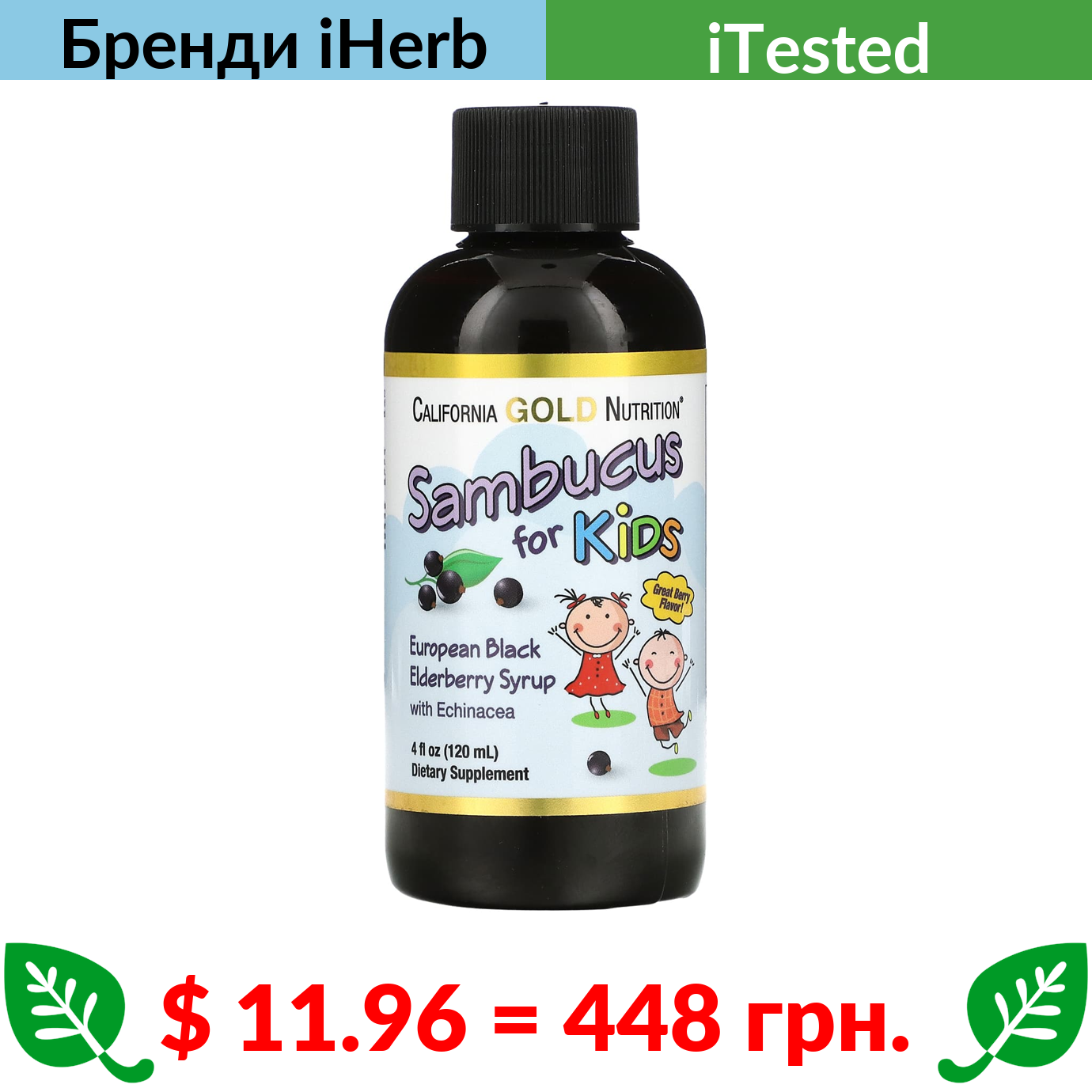 $ 11.96 = 448 грн. California Gold Nutrition, бузина для дітей, сироп з європейської чорної бузини з ехінацеєю, 120 мл (4 рідк. унції)