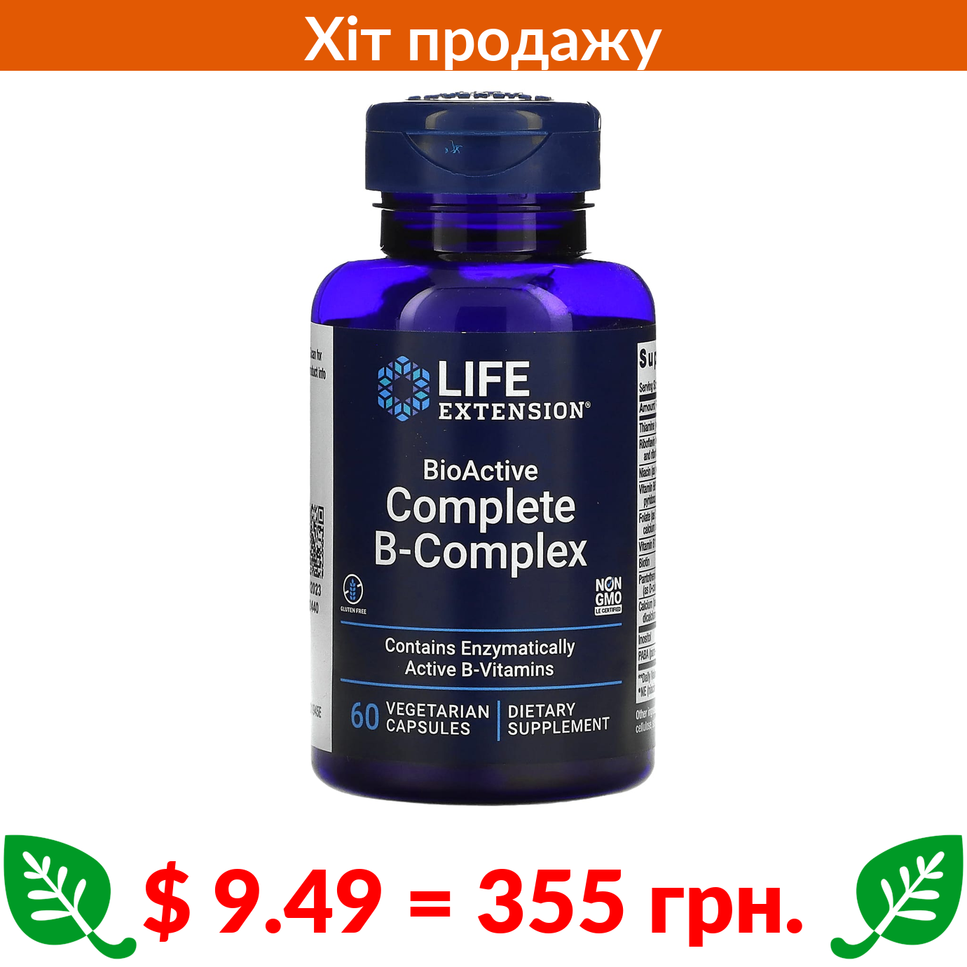 $ 9.49 = 355 грн. ????️ у кошику ????️ Life Extension, повний комплекс біоактивних вітамінів групи B, 60 вегетаріанських капсул