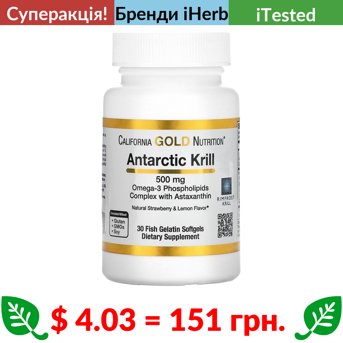 $ 4.03 = 151 грн. ???? cуперакція! ???? California Gold Nutrition, жир антарктичного криля, комплекс фосфоліпідів омега-3 з астаксантином, з натуральним смаком полуниці та лимона, 500 мг, 30 капсул із риб’ячого желатину