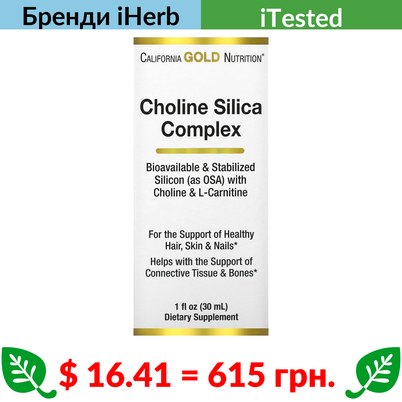 $ 16.41 = 615 грн. California Gold Nutrition, холіновий і кремнієвий комплекс, біодоступний колаген для підтримки волосся, шкіри та нігтів, 30 мл (1 рідк. унція)