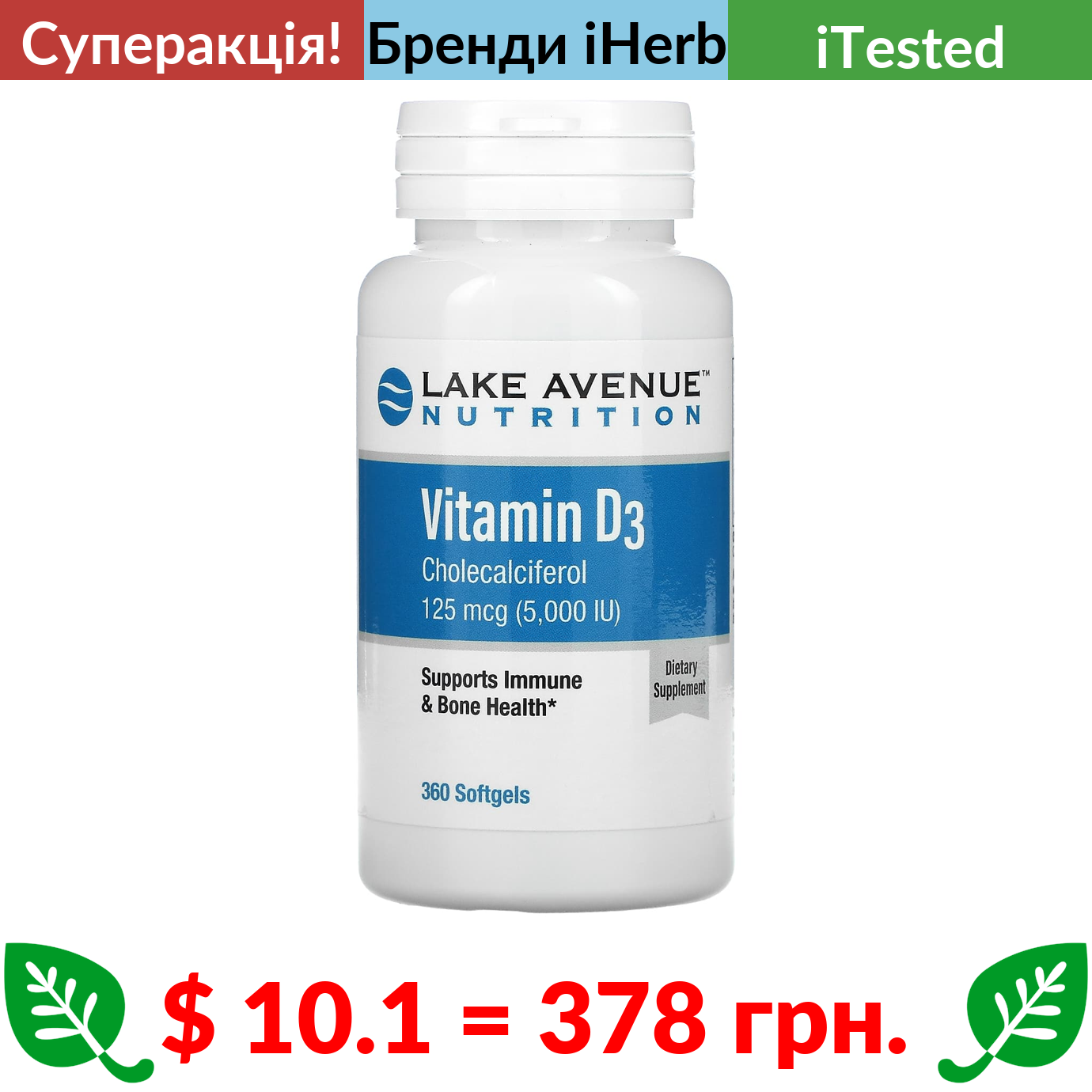$ 10.1 = 378 грн. ???? cуперакція! ???? Lake Avenue Nutrition, вітамін D3, 125 мкг (5000 МО), 360 капсул