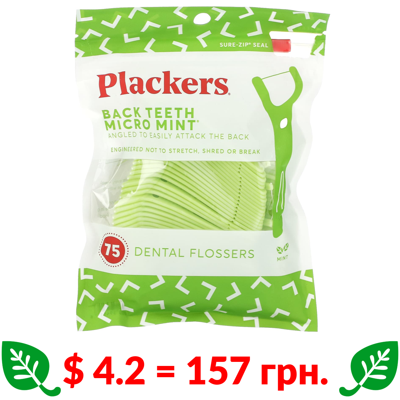 $ 4.2 = 157 грн. Plackers, Зубна нитка Micro Mint для задніх зубів, зубні нитки, м’ята, 75 шт