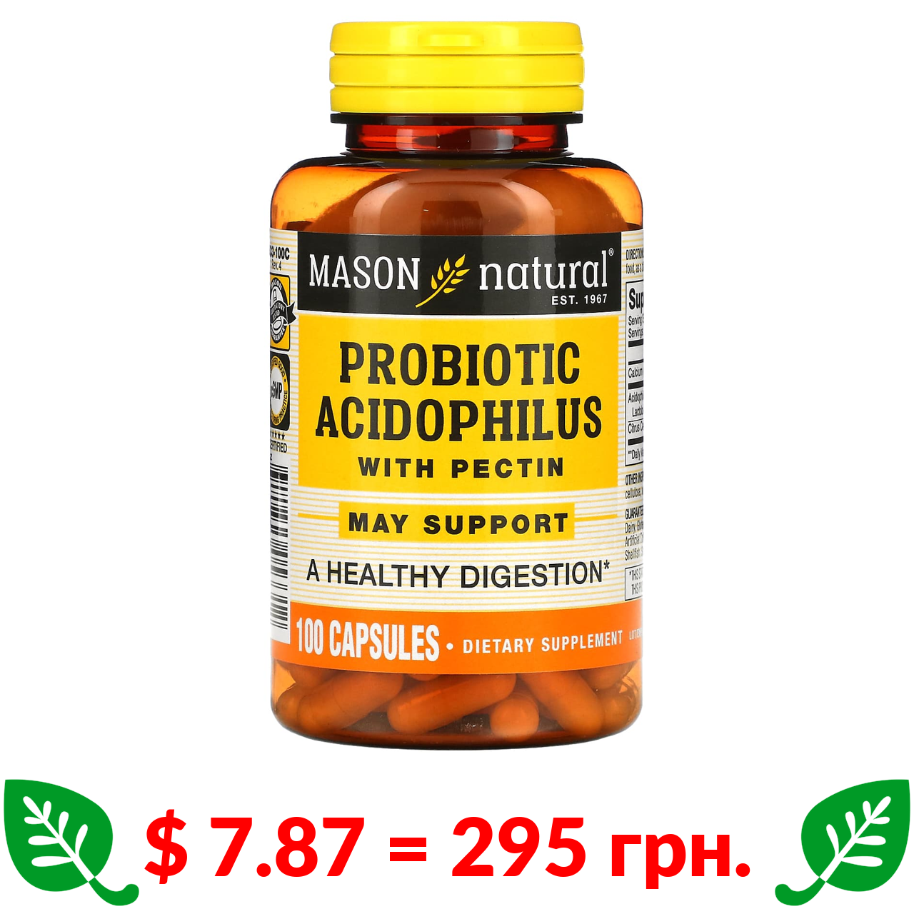 $ 7.87 = 295 грн. Mason Natural, пробіотик з ацидофільними лактобактеріями Acidophilus і пектином, 100 капсул