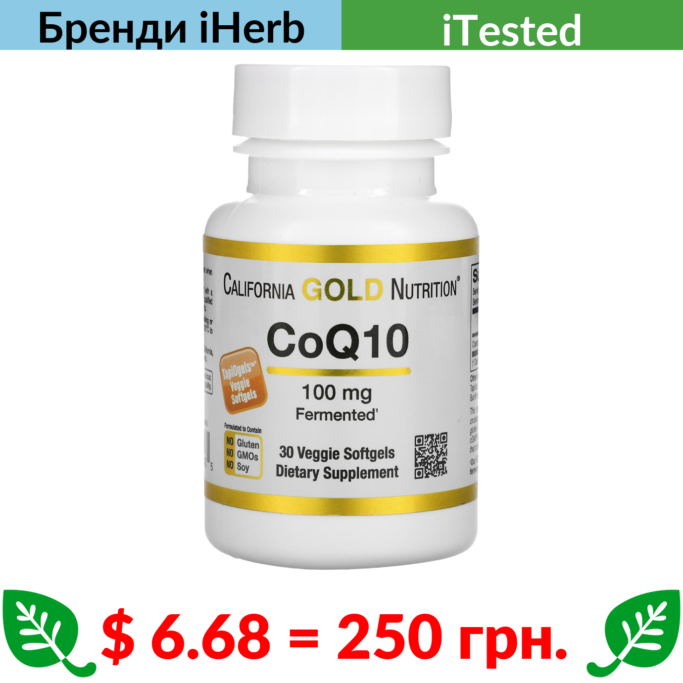 $ 6.68 = 250 грн. California Gold Nutrition, коензим Q10, 100 мг, 30 рослинних капсул