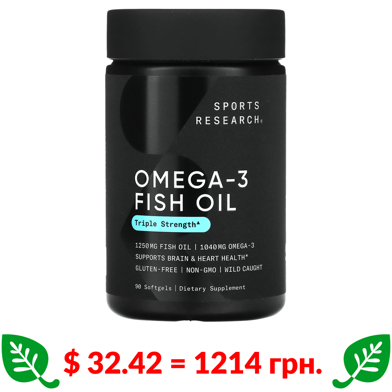 $ 32.42 = 1214 грн. Sports Research, риб’ячий жир з омега-3, потрійна сила, 1250 мг, 90 капсул