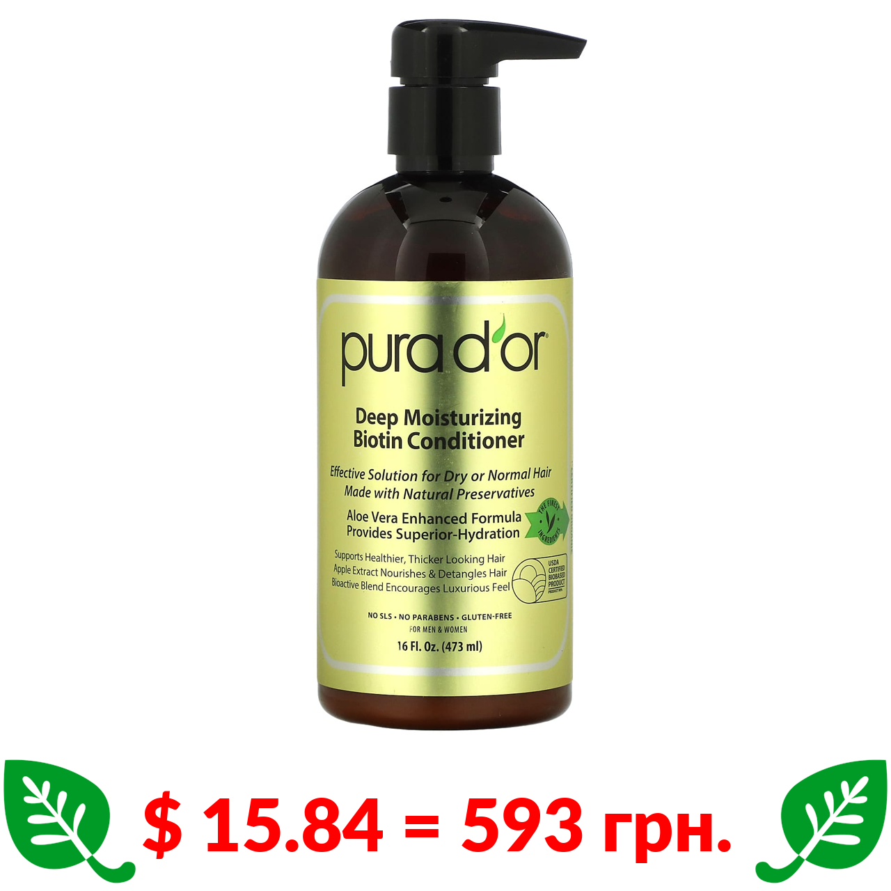 $ 15.84 = 593 грн. Pura D’or, Кондиціонер з біотином глибокого зволоження, 16 рідких унцій (473 мл)